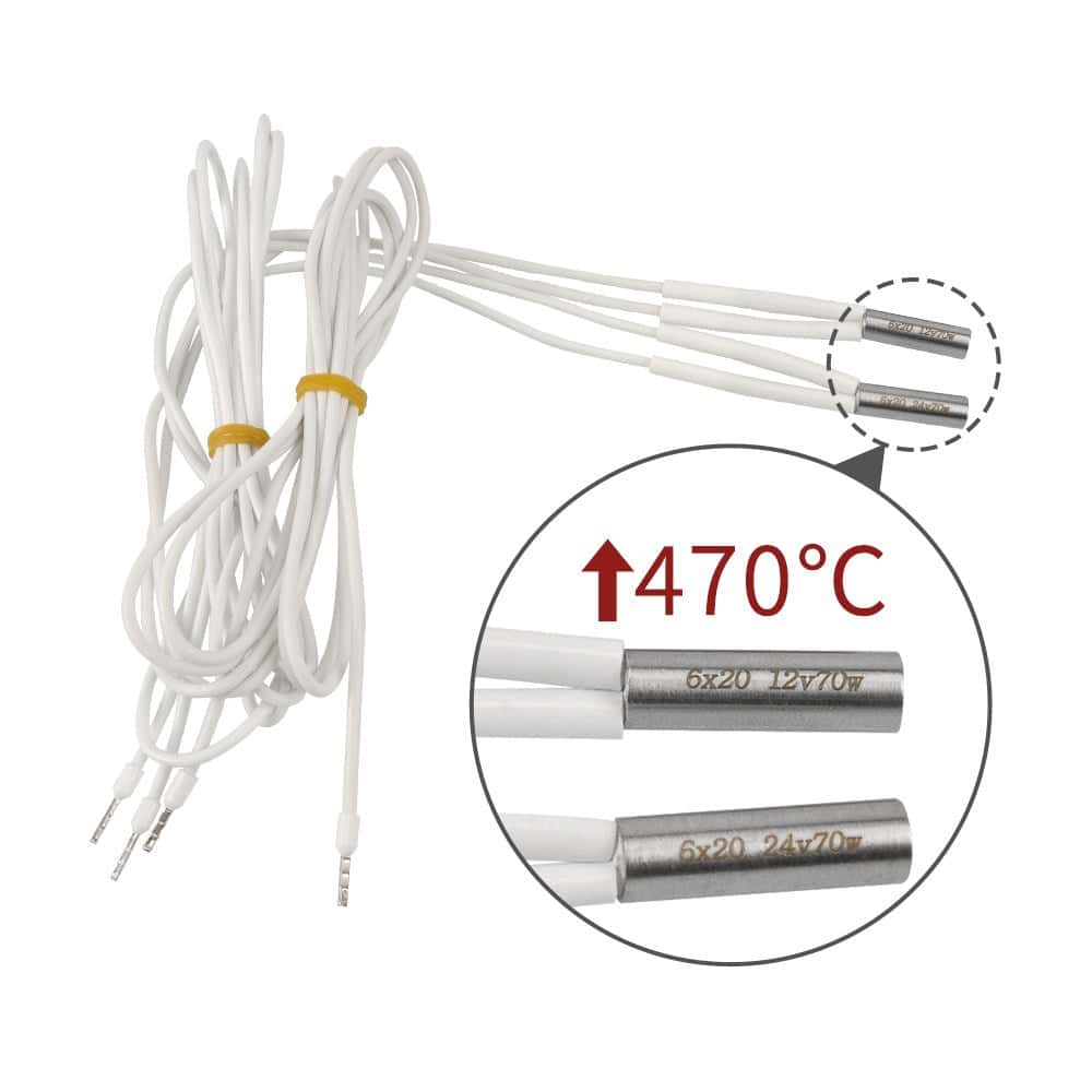 6*20mm 420℃-470℃ high-temp cartridge heater for 3D printers. Optional for both 12V and 24V input voltage. 50W / 60W / 70W power for printing high-temp filaments, like Nylon.